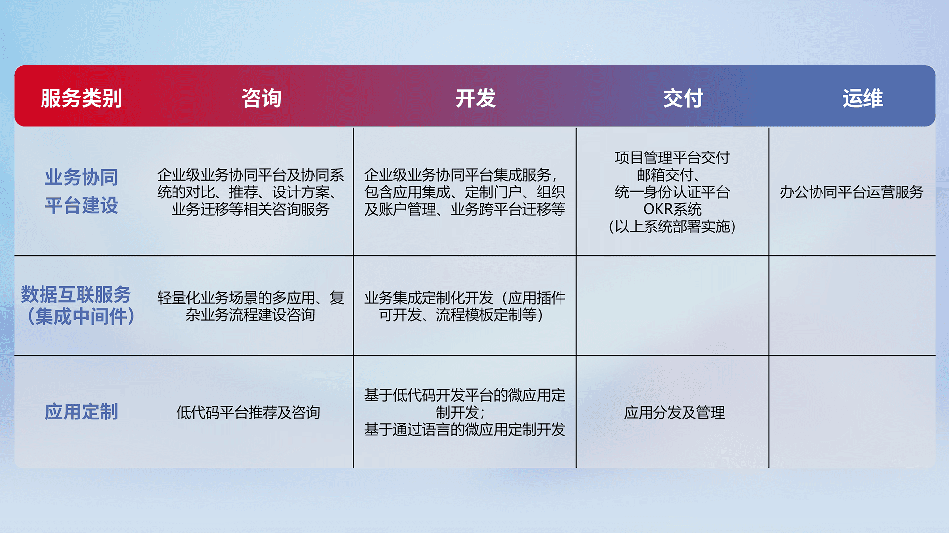 针对钉钉、、、企微、、、、IDaas等平台级产品提供产品的规划、、方案、、、、交付、、定制化开发等服务,,实现如统一协同办公、、、、智能客户服务、、、、混合会议管理、、、、智能数据查询、、等业务场景,,,,实现数字化转型。。。。
